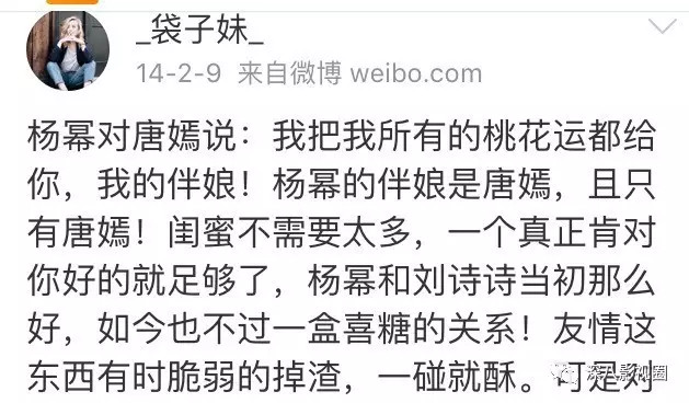 结果杨幂婚礼当天,微博上铺天盖地刷的都是“闺蜜不需要太多,一个真正肯对你好的就够好。杨幂和刘诗诗当初那么好,如今也不过一盒喜糖的关系”......