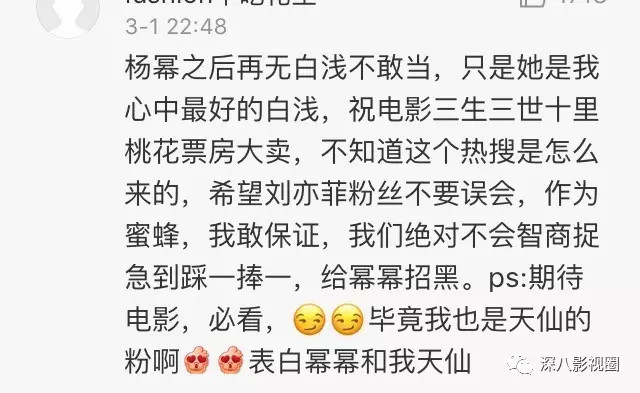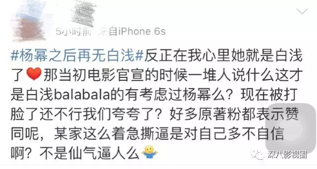 但大家都知道电影版三生三世还没上映呢,等看了刘亦菲版白浅之后,再做比较也不迟吧?别人的版本还没出来,就急着喊出杨幂版碾压的口号,让人觉得对另一方不太尊重,对大幂幂来说也招黑。