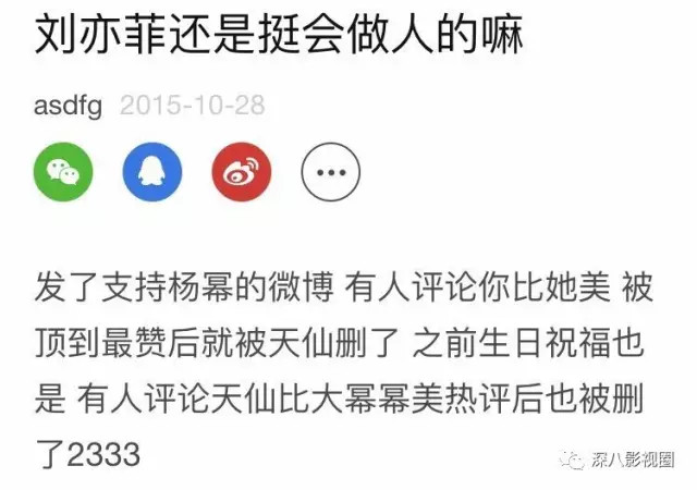 刘亦菲发微博时,还删除了有人说她比杨幂美的评论。
