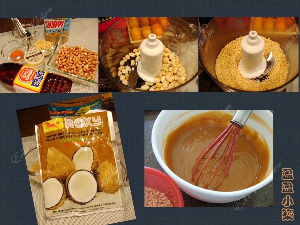 在一口小锅里把除了花生碎以外的所有材料混合,小火加热,用打蛋器不断搅拌至浓稠即可。如果用微波炉加热的话,把所有材料混合在一个可微波的深碗里,微波30秒,取出,混匀,再微波30秒至浓稠。