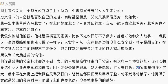 ,可能是说到有相似经历的人心坎儿了,引得呼声一片。末了,这姑娘还做了一总结:其实就是想说,有恋父情结的人,不是她爹太好就是她爹太糟糕,严重的缺爱性格缺陷,没啥好大惊小怪的。什么老男人更有钱?狗屁。一个有钱却跟我爹那样的粗暴老家伙和一个没钱却成熟稳重、知冷知热会疼人的男人,我肯定选后者。女人是感情动物,大多数不过是想被爱,不懂的人别瞎哔哔。