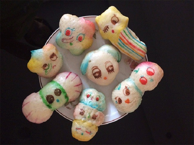 能尖日的作品具有实验性,一直探索用新的方式去象征、表达一个事物。她在刚刚结束的展览《时间膜》上,尝试用很多半透明的布,来象征时间。有的故事画在布的上面,有的故事被布盖住,而时间包括过去与未来,便有了向前和向后的方向,由此形成一张时间膜,膜的正面和背面就是时间的两个方向。她也在《奇魔馒头》展上陈列一个转盘,上面摆着一些奇形怪状的、包着迷你漫画书的馒头,交给观众来旋转,转到哪个故事,能尖日就在馒头上画出这个故事的结尾(用食用色素),结尾都是随机的。