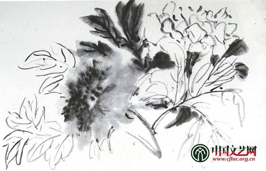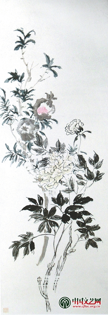 古代文人山水画家大都爱画梅兰竹菊,以期与山水品格一致,借以表现作者的那份超脱与清高,而鲜有画象征大富大贵的牡丹者。然而,擅画黑山水的黄宾虹,不仅同样爱画梅兰竹菊,同时也爱画山花野卉,还爱画牡丹。在黄宾虹笔下,明花与夜山形成了鲜明的对比。黄宾虹画牡丹的技法很丰富,得益于他那变化神奇的