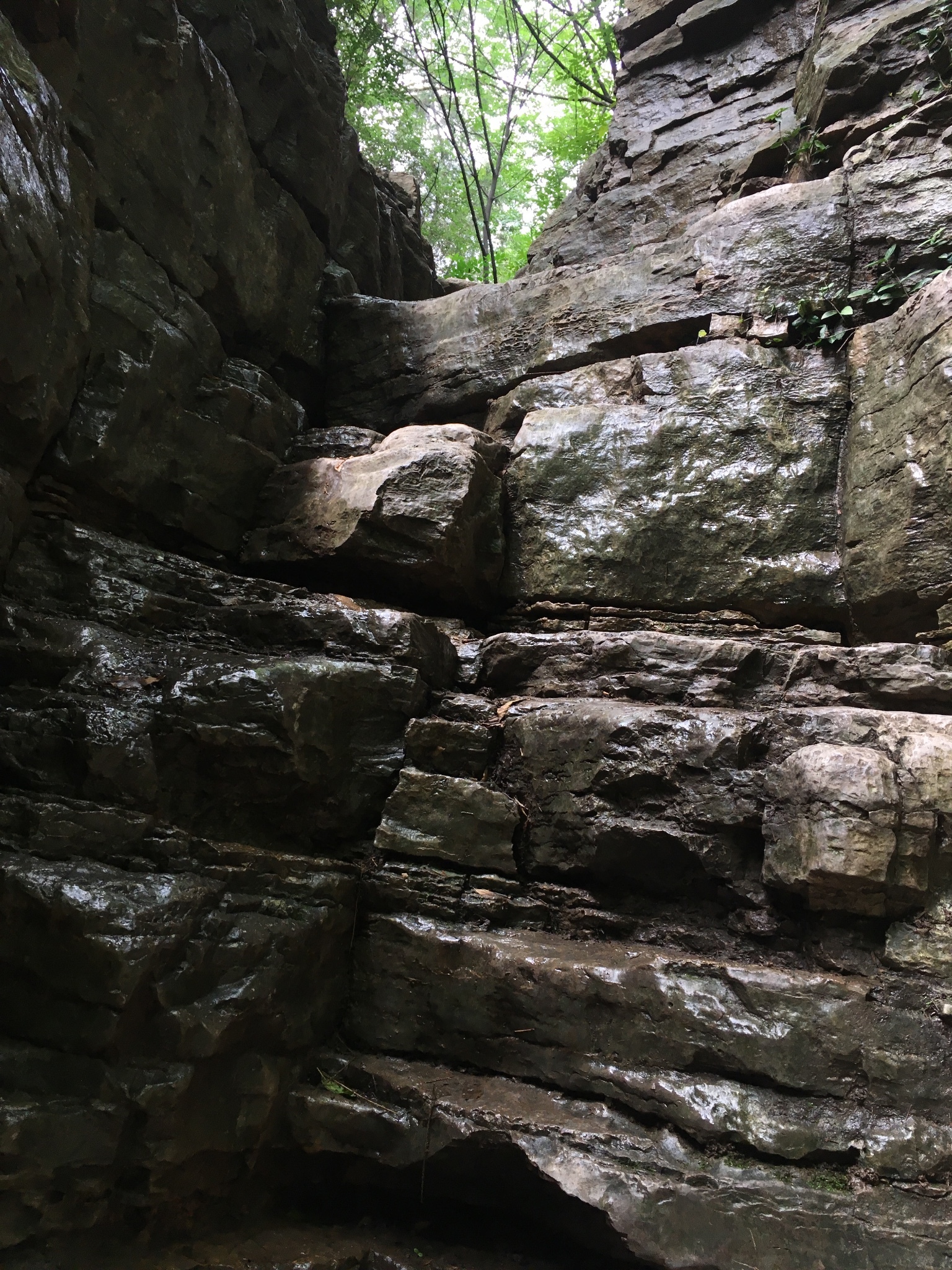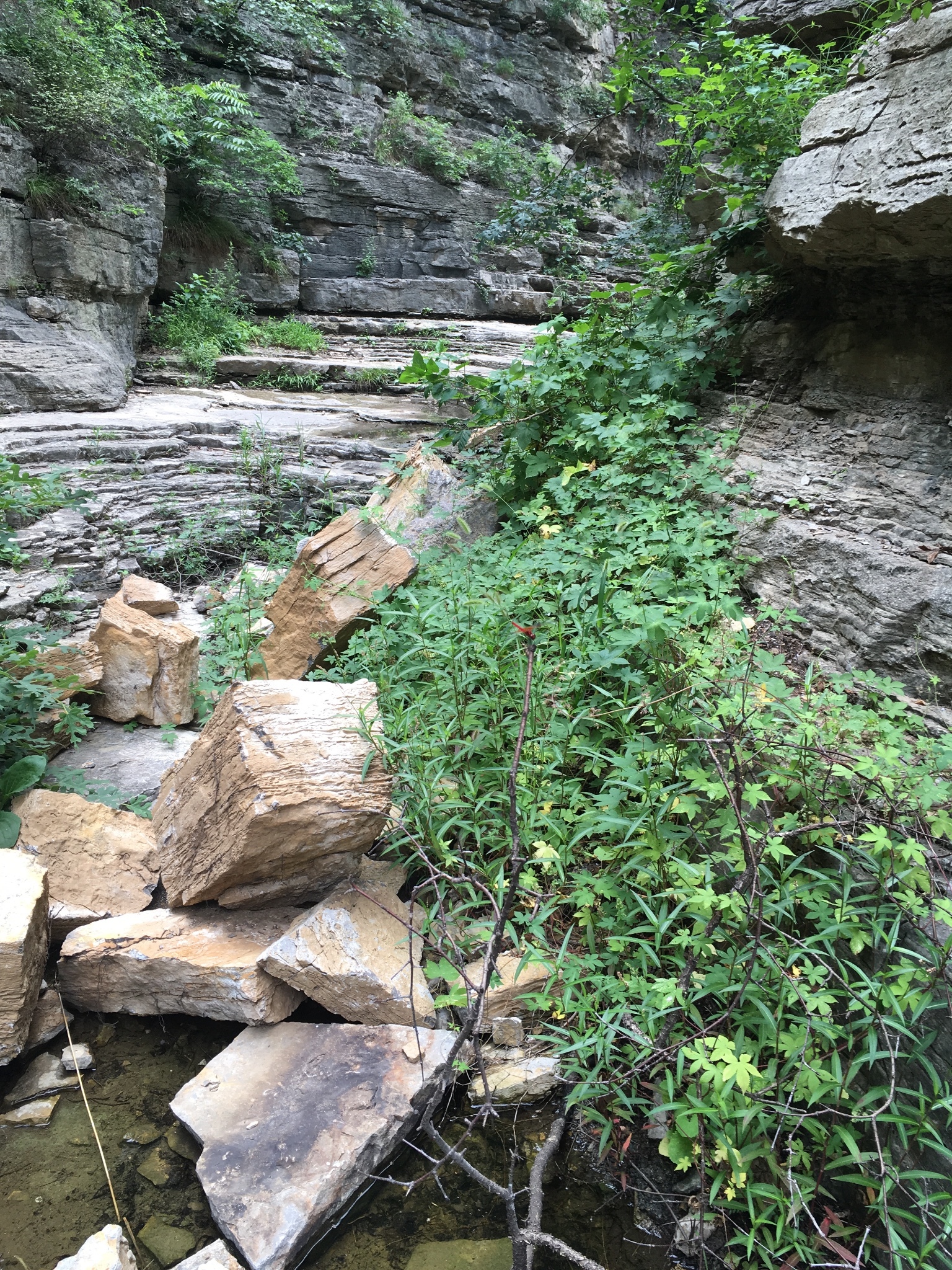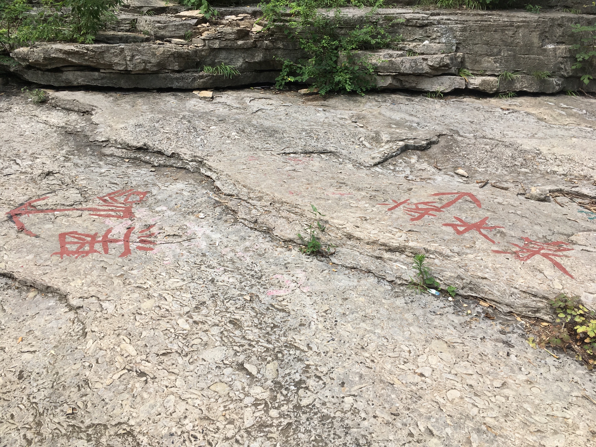 踩着湿滑的岩石下到谷底,回头望,才发现一块石头划有向上的箭头,处处有标记,指引进山出山的路