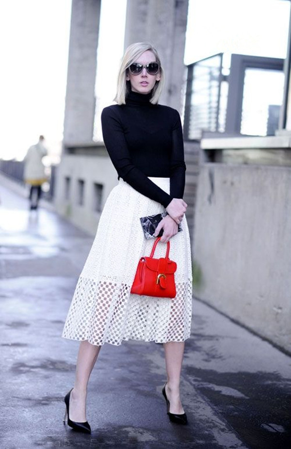 即便是黑色针织衫搭配白色纱裙也是高雅冷艳路线。