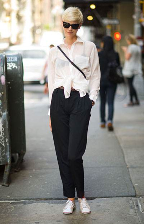 同样的着装,街拍达人的宽松感更显随意,清爽的短发让轻透的衬衫少了性感多了些叛逆不羁。
