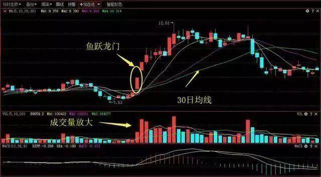 鱼跃龙门,是指股价K线经过连续几个交易日的下跌后出现拐头缓慢.上涨的迹象,5日均线、10日均线和30日均线也同步出现拐头向上迹象,某一交易日,股价K线上涨至30日均线附近时,直接跳空高开越过30日均线,并最终收于30日均线之上。该形态属于典型的看涨形态,如图5-1所示。