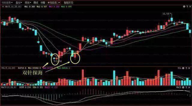 双针探海,是指股价在底部盘整过程中,形成的双底形态,且每个底部都有一根带长下影线的K线。双针探海与金针探底形态有些相似,该形态所发出的看涨信号更具可信度。