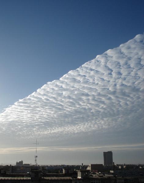 天上鲤鱼斑,指的是天空出现的鲤鱼斑状的云块。这种云块像鲤鱼身上的鳞片的颜色一样,常常是成行成列地排在天空,在云片之间有一些空隙,可以透过阳光,并且可以从云与云之间看到蔚蓝色的天空,在气象学上,称它为透光高积云。