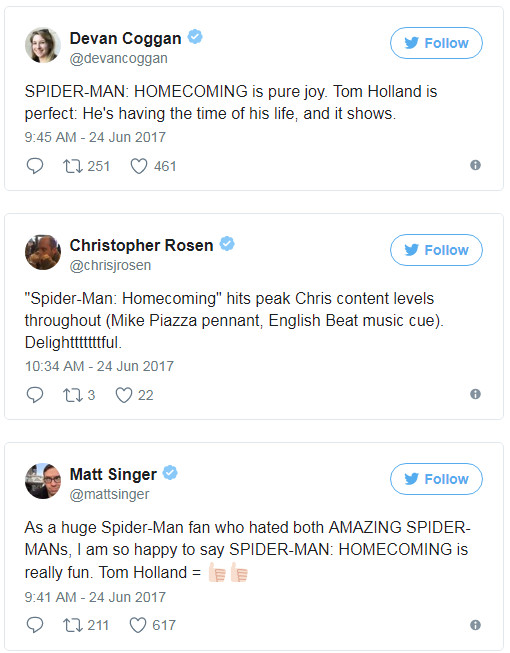 《娱乐周刊》的另一位影评人表示:“太太太太好看了!”(Delightttttttful!)其他同行也一致认同,纷纷表示“纯粹享受”“适合所有人看的蜘蛛片”“无瑕疵”。