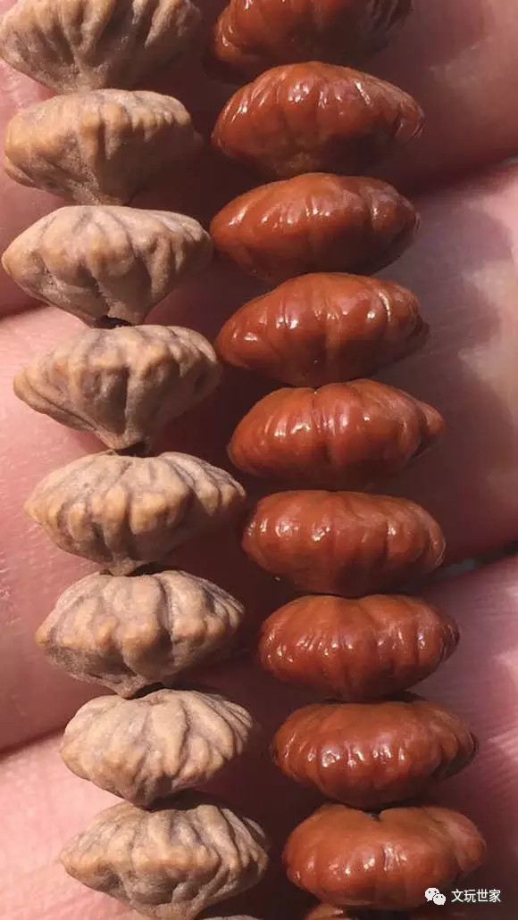 ②盘玩时保持手的清洁,如果有灰尘用牙刷清理干净,尽量避免菩提子之间的剧烈碰撞,避免掉齿。随着盘玩时间的变化,菩提逐渐上色包浆,呈现微红,包浆会越来越润。