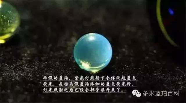 这是鉴别蓝珀最简单的方法了,就是将蓝珀放到验钞机下,上面会有荧光出现,天然蓝珀有极强的蓝色荧光,在紫光灯照射下,这种蓝色荧光会覆盖所有部位,而造假的蓝珀没有蓝色荧光或荧光反应很微弱。