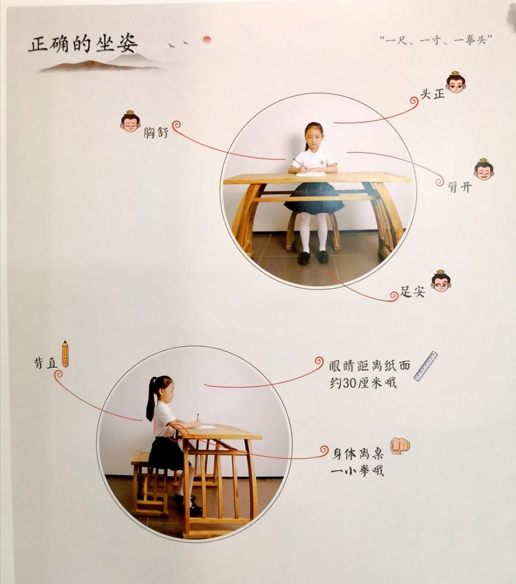 书写硬笔书法,如何养成正确的坐姿和执笔? 2019-11-14 11:43阅读: http://blog.sina.cn/dpool/blog/u/6073539728 运用正确的坐姿势与执笔书写姿势对于练习写字非常重要。正确的姿势,能充分调动人体机能,减轻疲劳还能促进少年儿童身体的健康发育,预防近视、斜视,脊椎弯曲等多种疾病的发生。只有姿势合理,才能为写好美字提供动力基础,书写才能得心应手。 硬笔书写的姿势分为坐姿和执笔两个方面。 坐姿图 正确的坐姿基本要求:头正、身直、胸舒、臂开、足安。 头正:头部正直,稍向前倾,不得左右歪斜,眼睛距离书写纸面“约一尺”。(