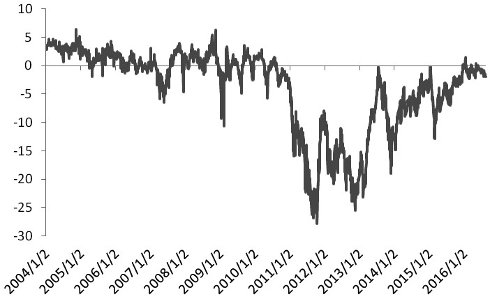 图为WTI/BRENT原油价差(2004-2016)