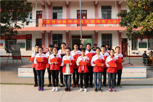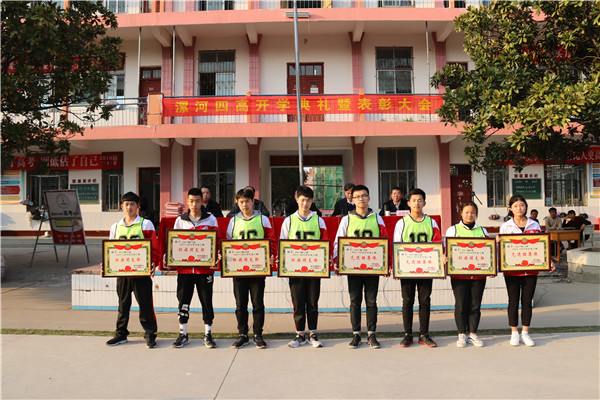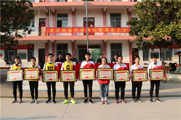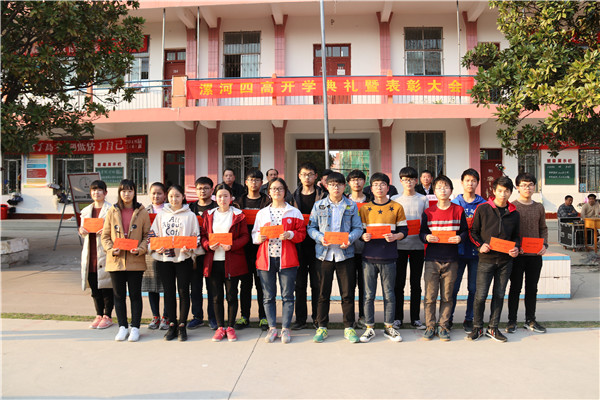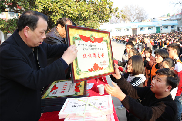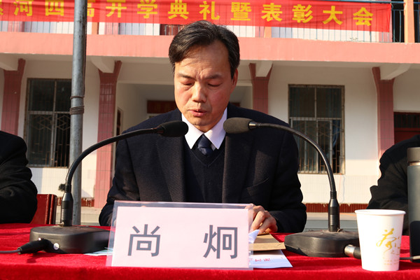 奋斗共圆梦想 实干创造佳绩----漯河四高隆重举行2017-2018学年度下期开学典礼暨表彰大会 2018-03-19 09:05阅读: http://blog.sina.cn/dpool/blog/u/6290686036 学校领导班子 开学典礼现场 学校党总支副书记尚炯主持开学典礼 3月13日下午,漯河四高东校区隆重举行2017—2018学年度下期开学典礼暨表彰大会。学校领导班子出席开学典礼。各处室、年级组负责人,教师代表,2015级全体学生,2016级、2017级学生代表参加典礼。开学典礼由学校党总支副书记尚炯主持。 校领导为获奖班集体颁奖