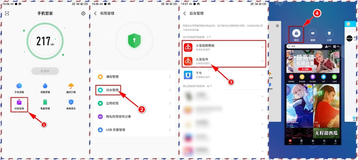 首先打开手机管家,点击“权限管理”,再打开“后台管理”,找到“火萤视频壁纸”允许后台运行,我们还可以将任务卡片打开,将其锁定,保证不被自动清理!