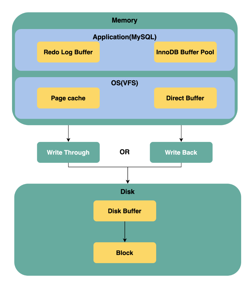 - Write Back:一次写操作仅仅更新了内存缓存区中的数据,数据落盘通常通过间隔一个时间进行落盘一次;