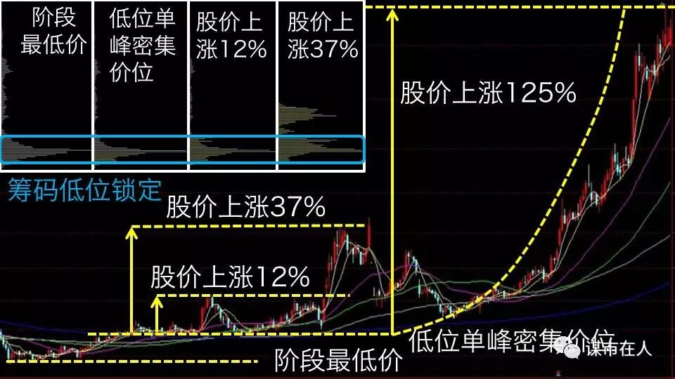 随着下密集峰筹码的不断减少,上峰的筹码却不断地同步增大。上峰密集的筹码全部来自下密集峰,是下密集峰部分筹码移位至上密集峰的结果。