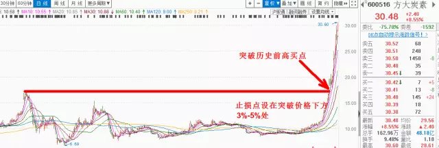 方大炭素可以说是今年最牛的个股,这样的牛股用到突破前高买入法可以完美抓住!方大炭素在今年7月7日涨停板强势突破历史前高17.37,盘中果断跟进,止损点设在买入价下方3%到5%,买入后价格没有打止损,突破后趋势开始加速,上升角度极为陡峭,以5日均线作为止盈一直持有,累计获利已达77%!