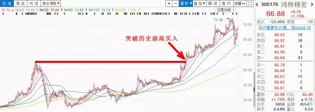 其二,稳健的投资者,可选择在突破前高点后,在前高点附近企稳并再度拉升时买进。