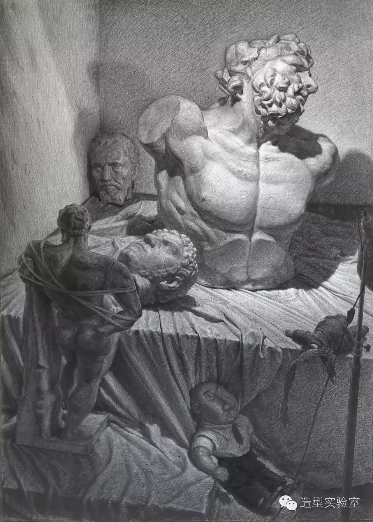 近几年对素描争论颇多,有褒有贬。其实素描是一门很宽泛的课题,可以是写实的,甚至精微的超写实,也可以是很表现或很抽象,关键是看画素描的目的。为创作服务的素描也可以说是为寻找新的绘画语言进行的实验性素描索,最关键是自由,考验想象力。作为基础训练的素描,阶段性的具象素描训练是绕不过去的。具象素描的训练,过去叫全因素素描训练,是对思维能力和观察力最直接和最有效的训练。如果说素描技法(多数人脑子里反映的多是写实技术,面就更窄了),单纯的某种技法训练不重要,重要的是与你的创作语言相匹配的的技术,这种技术不是别人教给你的,是你在创作中生发出来的你特有的技术语言。很重要有些问题是用语言很难描述的,只要你能相信我们能帮你解决你多年的积习,让你画好画就成了;你若没基础,别担心,那很好,干净单纯学得会更快。一般假期时间短,我们把写实技巧放在首位,能够及时见效。但我需要明确的是:写实技巧只是教学的一部分,一个引子,我们不以写实为目的,更主要的是以写实为研究方法,研究自然,总结造型规律,为创作铺垫道路。