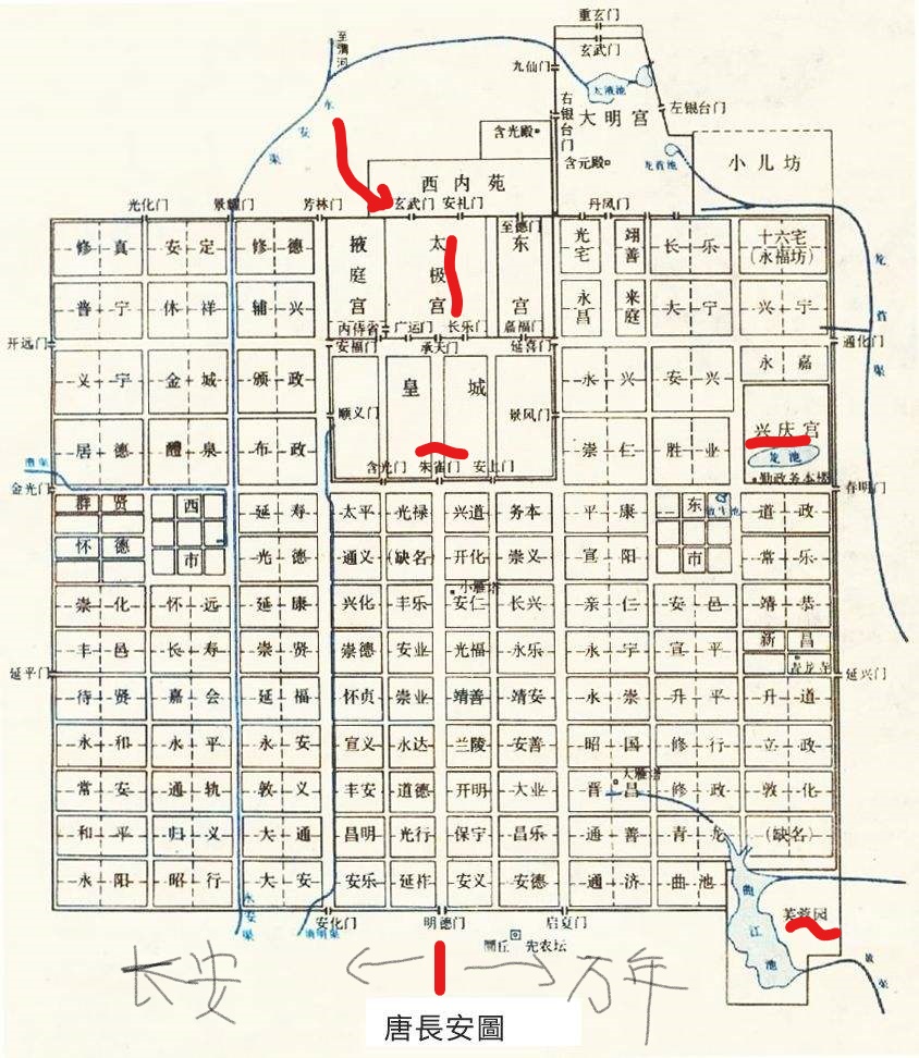 注释:长安皇城在长安城之北;长安外城分为两县管辖:朱雀门、明德门之间朱雀大街之西为长安县,之东为万年县,曲江池(芙蓉园)在长安城东南角。玄武门之变发生在皇城太极宫北门玄武门内,详见图2。兴庆宫原是唐玄宗王府,兴庆宫南的勤政楼是唐玄宗接见使团、与民同乐的地方;朱雀门与兴庆宫之间的平康里,是唐代吃喝娼盛之地。至于明清时期的西安城,规模远小于唐代,唐代的朱雀门外差不多就是明清的南城墙了。