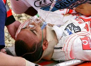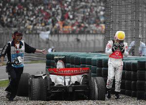 欧洲大奖赛排位赛第三节,汉密尔顿在纽博格林赛道的中断毫无征兆的情况下径直冲向护墙,撞击速度接近每小时200公里。慢镜头回放显示汉密尔顿出事前赛车右前轮螺栓飞出。汉密尔顿从赛车爬出后感觉身体不适,被立