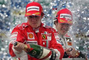 莱科宁狂喷香槟,他是新的世界冠军。阿隆索在对手身后,虽然失去了世界冠军但仍然喷得尽兴。银色纸屑从天而降,领奖台上的两位世界冠军仿佛一家人般的和谐。