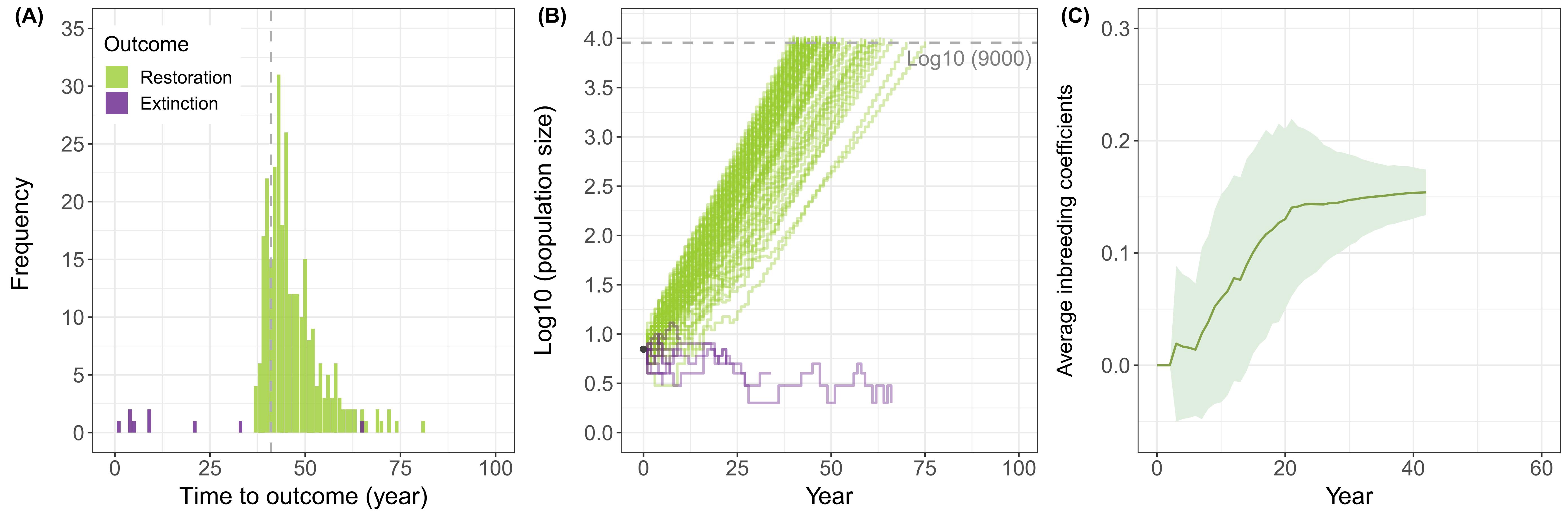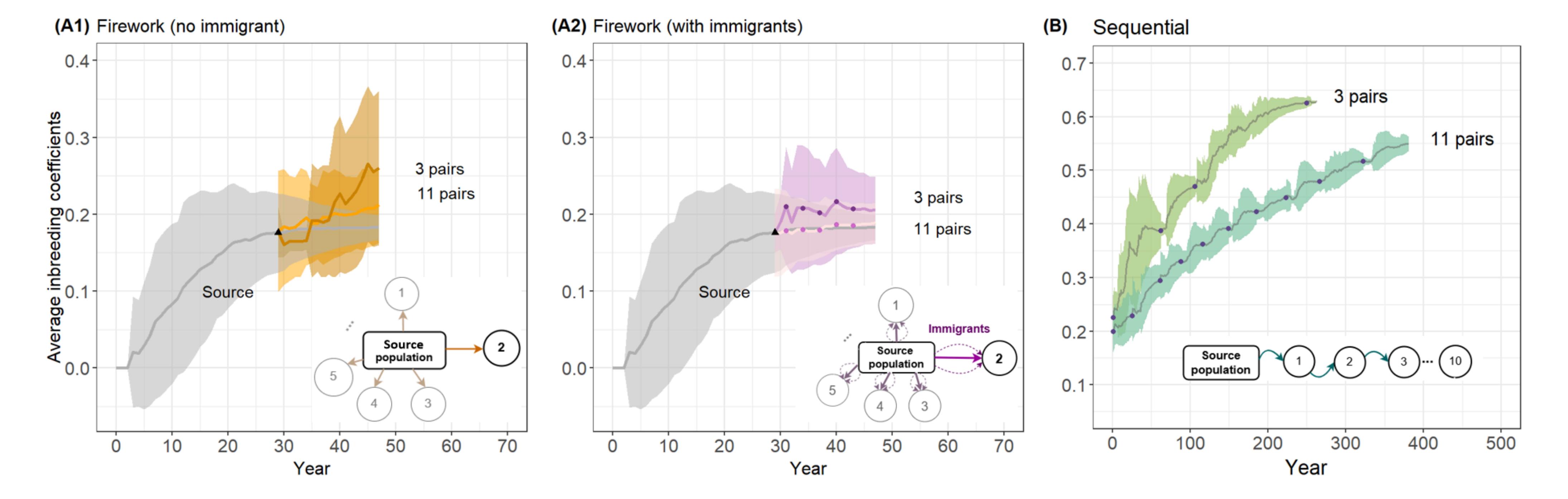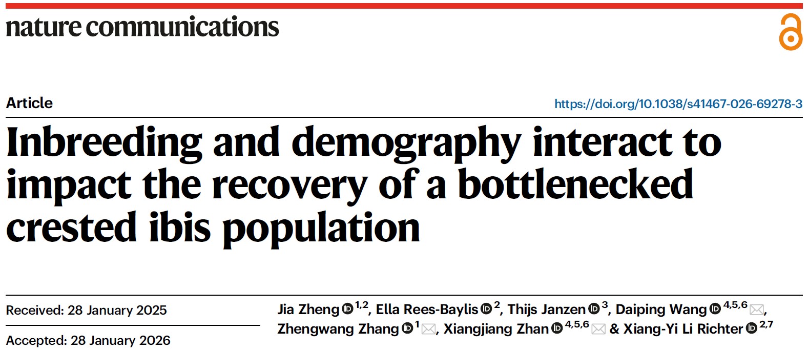 濒危物种的保护是生物多样性保护项目的重中之重。一方面,这些物种因经历过严重的生态灾难,陷入了极小种群的生态瓶颈;另一方面,由于现存种群数量、资金和生态不确定性的限制,许多物种的再引入项目不得不以小规模种群开展保育工作。这些脆弱的小种群不可避免地存在着近亲繁殖,表现出近交衰退(如近交个体的生育力低,后代死亡率高等),基因多样性下降,甚至最终导致许多保护项目的彻底失败。尽管如此,在采取了就地保护的措施后,一些物种仍能顺利度过此类遗传瓶颈,实现种群有效的恢复和种群数量的不断壮大。目前,保护生物学领域对导致这两种截然不同保育结果的原因知之甚少。朱鹮的保护是由我国实施的、具有世界代表性的濒危物种成功复壮的案例之一。早在上世纪中叶,野生朱鹮一度被认为在全球范围内濒于灭绝。1981年,中国科学院动物所专家在我国陕西洋县境内再次发现7只野生朱鹮个体。从那时起,中国就开始大力支持野生朱鹮的物种复壮,至今已陆续进行了长达四十多年的栖息地保护、人工繁育及野化放归工作。截至2022年,朱鹮的全球物种数量从最初的7只恢复到超过9000只。笼养朱鹮的谱系分析发现,朱鹮个体的近交程度与其卵的孵化率显著负相关,存在实质性的近交衰退。既然如此,朱鹮为什么仍可以从极小规模的瓶颈种群顺利恢复到目前的状态呢?朱鹮保护项目的成功是偶然还是必然?该物种复壮的案例可以为世界保护生物学发展提供哪些启示?