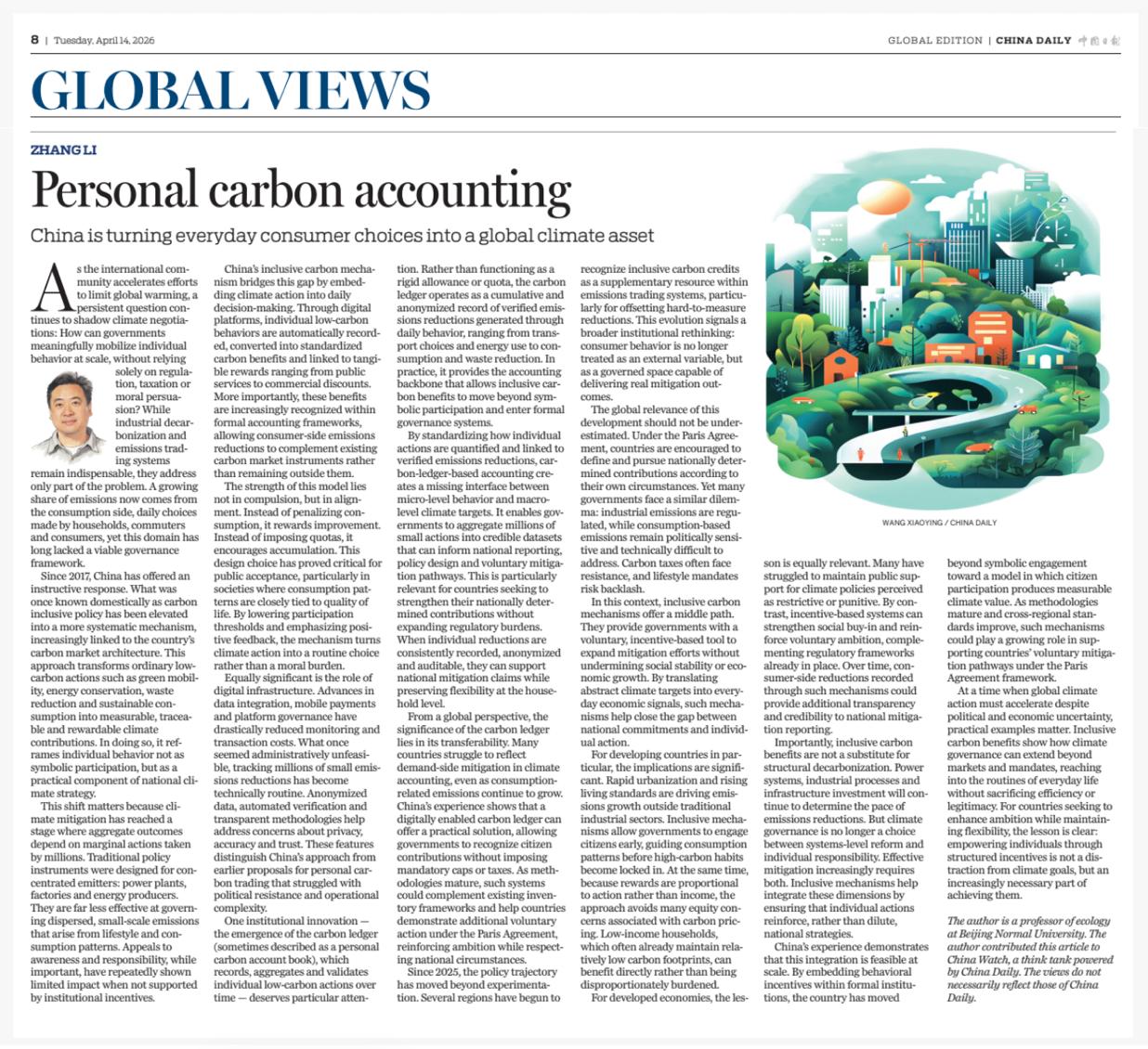 Views”版面发表题为“Personal carbon accounting: China is turning