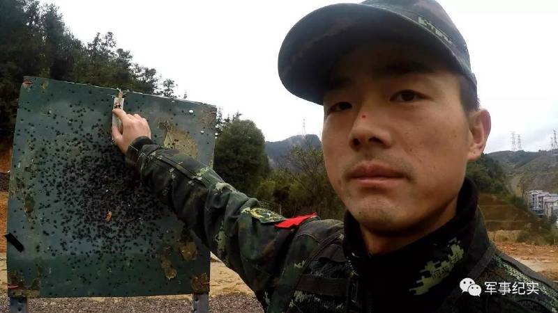 在铜钱靶射击考核中,由于下着小雨,瞄准镜上不仅有水滴,镜框里面还出现了雾气。尽管目标非常模糊,何英树还是果断迅速地扣动了扳机。
