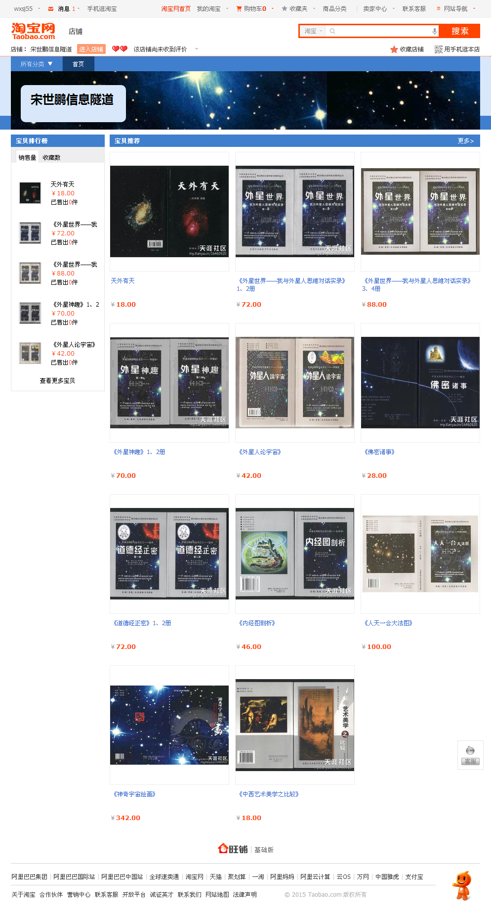 《宇宙文明系列丛书》淘宝店启动 2015-04-04 18:14阅读: http://blog.sina.cn/dpool/blog/u/1370538025 《宇宙文明系列丛书》淘宝店已经启动。店铺名:“宋世鹏信息隧道”,读者也可以到淘宝店选请宇宙文明系列丛书。请点击本站友情链接最下边第四个图标,即可进入店铺。或者在淘宝网搜索店铺“宋世鹏信息隧道”,也可以进入店铺选请。 以下是广告 全球目前唯一一套地球人与外星人和宇宙高智能生命思维对话真实记录的奇书: 1、《外星世界——我与外星人思维对话实录》,一、二、三、四册。 2、《外星神趣》一、二册。 3、《外星人论宇宙》。 4、《天外有天》。 5、《佛密诸事》。 6、《道德经正密》一、二册。 7、《内经图剖析》。 8、《人天一合大法图》 9、《神奇宇宙绘画》是由罗和平先生画,由宋世鹏翻译的画册。 10