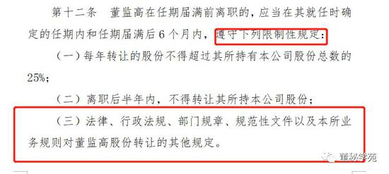 公司董事、监事、高级管理人员应当向公司申报所持有的本公司的股份及其变动情况,在任职期间每年转让的股份不得超过其所持有本公司股份总数的百分之二十五;所持本公司股份自公司股票上市交易之日起一年内不得转让。上述人员离职后半年内,不得转让其所持有的本公司股份。公司章程可以对公司董事、监事、高级管理人员转让其所持有的本公司股份作出其他限制性规定。