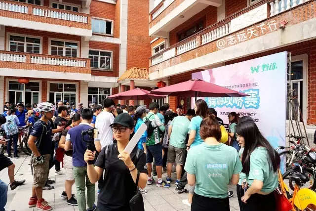 ▲签到后,领取任务地图和盖章本,打开摩拜,每个人领一辆车,在主席台前合影,准备出发。
