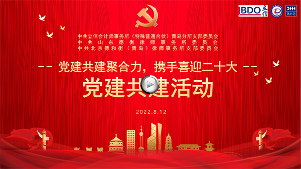 2022年8月12日,作为山东省委组织部、省委两新工委认定的“省级两新组织党建工作示范点”的立信会计师事务所(特殊普通合伙)青岛分所(以下简称立信青岛分所)党支部、山东德衡律师事务所(以下简称德衡所)党委及市南区“百千万提升工程”培育对象北京德和衡(青岛)律师事务所(以下简称德和衡青岛所)党支部共同举办“党建共建聚合力,携手喜迎二十大”党建共建活动。