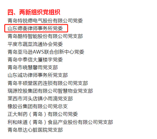 喜报!德衡所党委被评为“2021-2022年度青岛市五星级基层党组织” 2022-09-16 09:35阅读: http://blog.sina.cn/dpool/blog/u/1411362820 为迎接党的二十大胜利召开,展现在习近平新时代中国特色社会主义思想指引下青岛基层党建的生动实践,青岛市委组织部组织开展的争创2021-2022年度青岛市五星级基层党组织活动于9月15日公布结果。经过层层选拔和集体研究,德衡所党委等114个基层党组织被评为“2021-2022年度青岛市五星级基层党组织”。 此前,在本次评选活动组织的“基层党组织书记擂台比武,争创2021-2022年度青岛市五星级基层党组织活动”(两新组织专场)中,德衡所党委副书记王隽代表党委以《“三个坚持”打造过硬律师队伍》为题,从“坚持组织引领,确保正确政治方向”“坚持先锋引领,打造过硬律师队伍”“坚持行动引领,树立良好社会形象”三个方面汇报了律所党建工作,充分展现了德衡所创建“德衡律师党旗红”优秀党建品牌,积极为国家法治建设贡献德衡力量的先进经验做法。最终以94.16的高分在23家参赛党组织中脱颖而出,夺得擂台赛第二名。