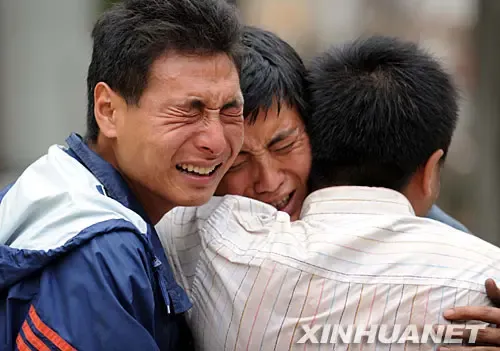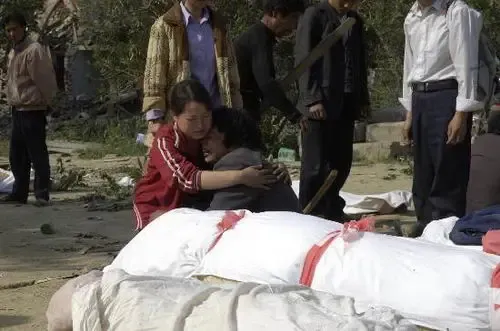 5月15日,木鱼中学学生白妤蔓的父母(前)在女儿的遗体前悲痛万分。在汶川地震中,四川省青川县木鱼中学275名学生死亡,30名学生下落不明。新华社记者