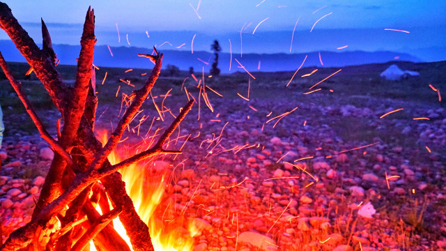 晚上就来个篝火晚会吧,搭起棚子,点燃篝火。