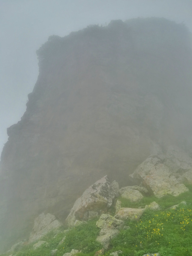 小雨,这里海拔大约2500米左右,换上薄羽绒服,厚冲锋衣,套上雨披,怕相机受潮,放进相机包中,改用手机拍照。