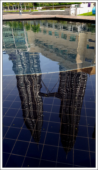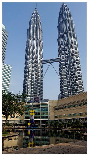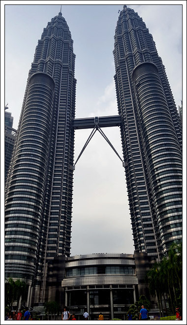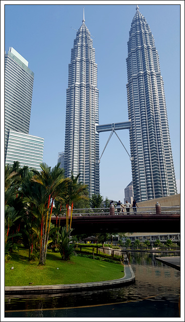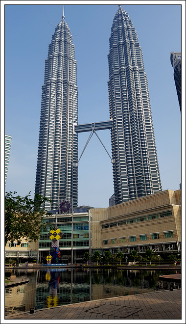 双子塔外观恢弘,前面有小喷泉广场,后面有公园湖水,内部是一个大商场,也有食肆,交通也方便,门前的蓝色出租车比较贵吉隆坡石油双塔曾经是世界最高的摩天大楼,目前仍是世界最高的双塔楼,也是世界第八高的大楼。坐落于吉隆坡市中市(Kuala