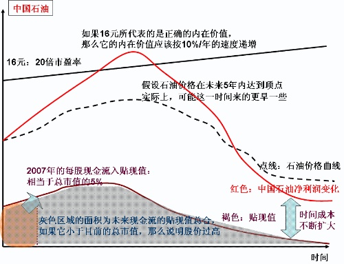 单从“内在价值”的角度考虑,石油价格的未来变化是最为主要的影响因素。从悲观的角度考虑,如果石油价格在1-3年内走向下坡路,那么20倍的市盈率无论如何都算是高估的离谱。因为这意味着当前是它盈利能力最好的时机,如果一家公司在盈利能力最好时,也只能获得5%左右的投资回报(相当于20倍的市盈率),那么当盈利出现下滑时,可想而知,这项投资的长期回报率必然会低于5%。(从这一点考核周期性行业,任何一个处于周期顶峰的公司,给与他们高于10倍市盈率的股价,显然就已经开始有点离谱)。如果从乐观的角度考虑,石油价格从5年之后才开始下滑,那么在价格下滑之前的“现金流入贴现值”是支撑它的市值的主要因素,大约占到其内在价值的80%的份额。即便我们极度乐观的估计在它达到顶峰时能够获得当前两倍水平的现金流入,恐怕也是较难支持20倍市盈率下的股价水平。那么,这项投资即便在最为乐观的角度考虑也是很难超越10%的年收益水平。(如果从乐观的角度考虑,想来中国石油还是有可能可以支持8-10元的股价水平的;如果考虑人民币升值对美元投资者的诱惑,可能可以再高一些。)