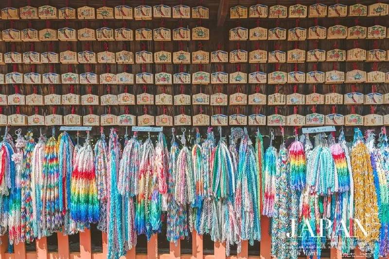 门口还挂着不少祈福牌和这种彩色的绳子,光一照色彩真的很鲜艳。总之,这里给我的感觉就是在日本神社界就相当于梵蒂冈那个圣彼得大教堂之于天主教。绝对是当之无愧的日本神社之最!