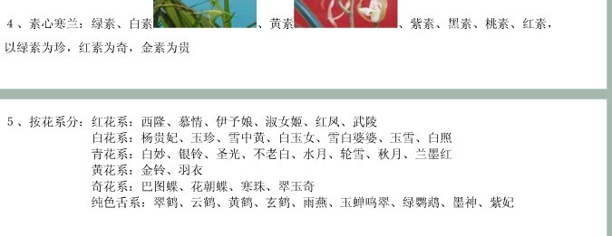 分程度。还有流色舌,就是最初白的底色以后有桃红颜色染上的情况。这样的舌的评价困难,生气消失了好像对颜色变化的情况做扣分(说的是我们称作刺毛素的一类花)。极罕见然而舌的底色翠绿颜色的话。这个还是能有较高评价的。还没出现杭州寒兰,完全素对素舌的同格评价。