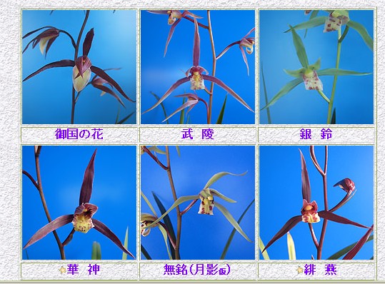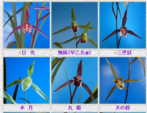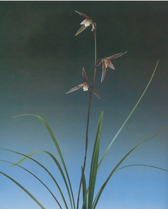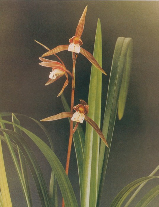 台北坪林山区,苗采山地及花莲地区。该品种叶色深绿,叶面光滑如墨兰,但叶姿较矮小,叶长3050厘米,宽0.6~0.9厘米。花莛20~25厘米,通常仅1~2朵花,花径5~6厘米。花色为褐色或紫褐色,花浓香,似春兰,花期则与迟开的墨兰相同。其珍品被命名为颂春。