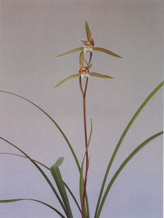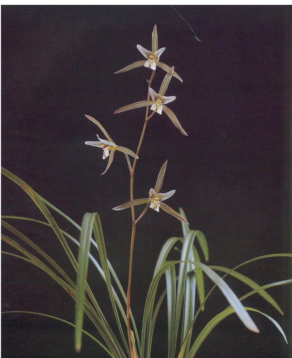 它是阔叶春兰与一二月的晚花寒兰的自然杂交种。发现