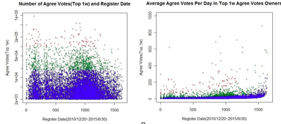 让我们一起看看以下几组数据截图,横轴为时间变化,我们截取了2010年12月20日知乎内测以来到2015年6月30日赞同数前10000的用户,根据他们的注册时间和赞同数作图,以及日均的赞数增长量。大家可以看到这些点分布的比较散,说明增长情况比较均匀。