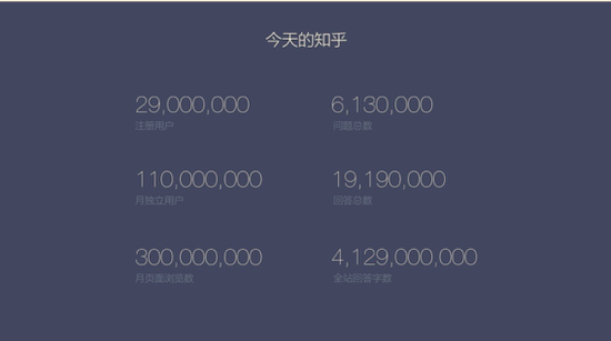 截至2015年7月,知乎社区已拥有2900万注册用户,月UV1.1亿,月累积页面浏览量达3亿。现在知乎全站已累计产生约620万个问题,以及近2000万