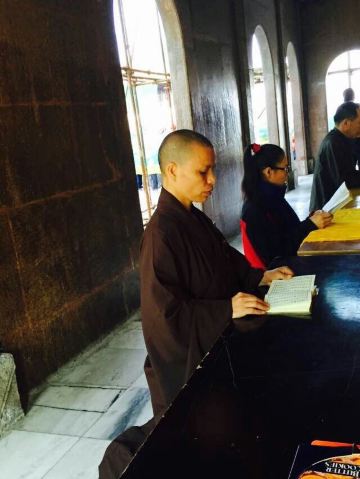 1. 三点钟起香,就从我们佛堂起香,九步一拜到九华山大门口祇园寺,因为她平时不怎么运动,坐禅可以坐一天,第二天再三步一拜到九华山肉身宝殿,诵部地藏经,大愿圆满。两天时间