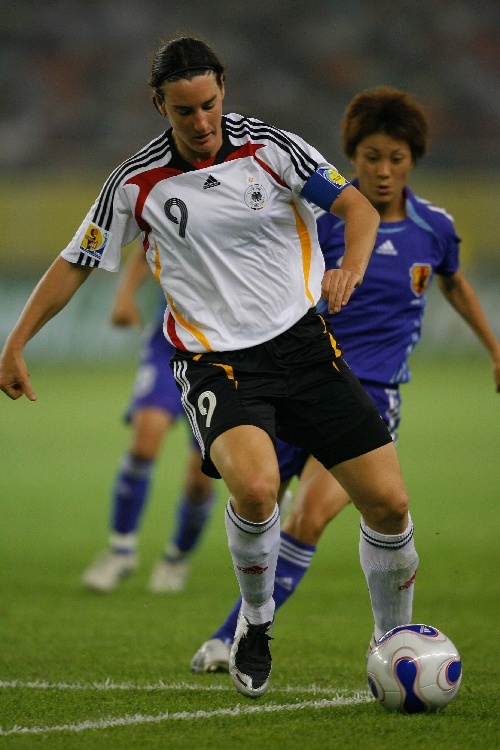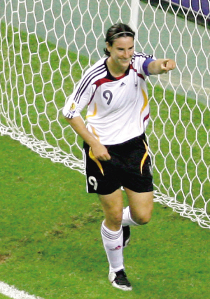 比尔吉特·普林茨有人说:如果普林茨身为男性,那么她将成为另一个马拉多纳。但球王没有她的幸运,这是她第三次打进世界杯决赛,第二次捧起冠军奖杯。99年第一次决赛对垒挪威,她只有不到半场的表演机会;03年她以绝对核心的身份帮助球队拿到冠军;而第三次,她仍然是冠军球队中最闪耀的一个。不仅仅是因为那粒金子般的进球,更因为她本身就代表了女足运动的一个传奇。