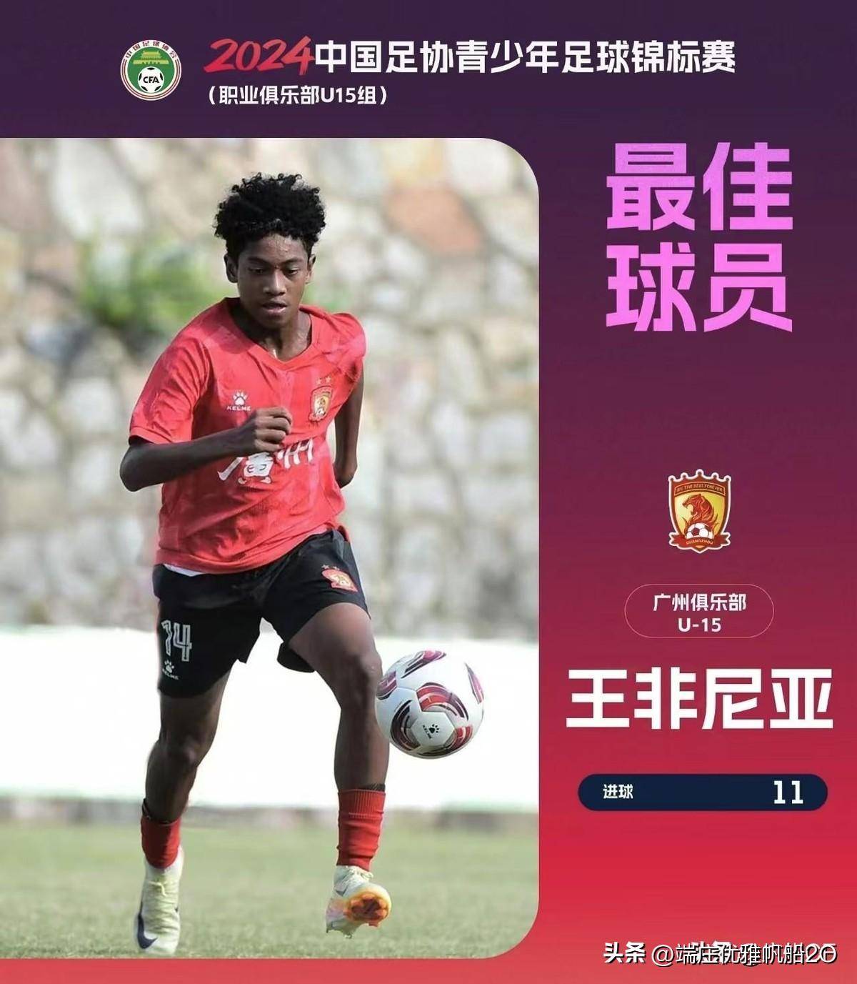 最近,恒大足校的U15球队在全国青少年足球比赛中爆了冷门,拿下冠军,说实话,这个真让我有点小意外。比赛是在11月16日,地点嘛,就是中青赛的决赛,广州队对阵上海申花,比分是2-1,广州队赢了。这个比赛全靠一个小伙子王非尼亚,他在关键时刻进了决定性的球,带领广州队拿下胜利。你知道的,这小子不仅会踢球,还拿了最佳球员奖,整个比赛进了11个球,名副其实的“进球机器”!